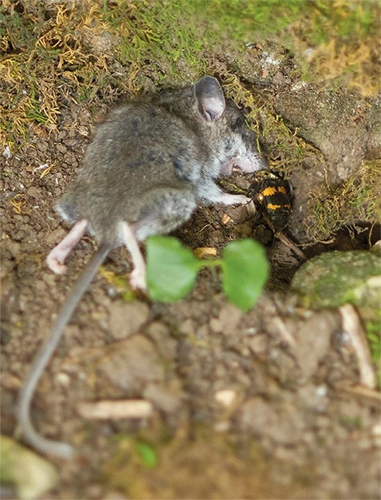 Then one day last July, as I was stacking my wood for the coming winter, I noticed a small black and orange beetle around one of the disposed mice. Fascinated, I watched for over an hour as a tomentose beetle (Nicrophorus tomentosus) dug a trench alongside the mouse and ever so slowly rolled the mouse into it. Another beetle arrived and went under the mouse and removed more soil. If I disturbed them, the beetles would bury themselves quickly, then resume work in a matter of minutes once they felt safe. The carcass was gradually lowered into the ground until it was interred.