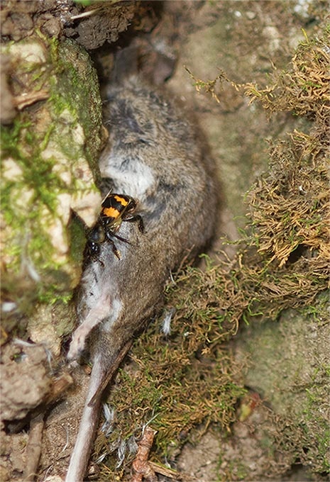 Flies are quick to lay their eggs on the carcass before it’s buried, which can compromise it. Burying beetles combat these dipteran competitors by destroying their eggs and larvae, and they get some help from phoretic mites (Uroobovella nova) that are reported to pierce and eat the fly eggs and freshly hatched maggots. It’s a two-way relationship: The mites cling to the beetle’s body for transportation and reproduce in the beetles’ brood chamber.