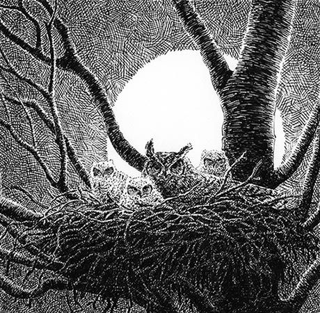 But before that can happen, the male owl – the one with the higher voice of the two calling back and forth out there – has to bring to the nest his courtship gifts, presentation pieces he lays on the brim of a matted construction site the size of an automobile tire. Sometimes it’s an old hawk’s nest the two owls have appropriated; other times it’s a nest they’ve returned to year after year, since they’re monogamous. The gifts consist of rabbits, skunks, cats, mice, moles, voles, toads, frogs – you name it. As the female sits on her eggs, there’s liable to be a heap of fur, or rather furs, hanging over the nest’s edge, though not elegantly.