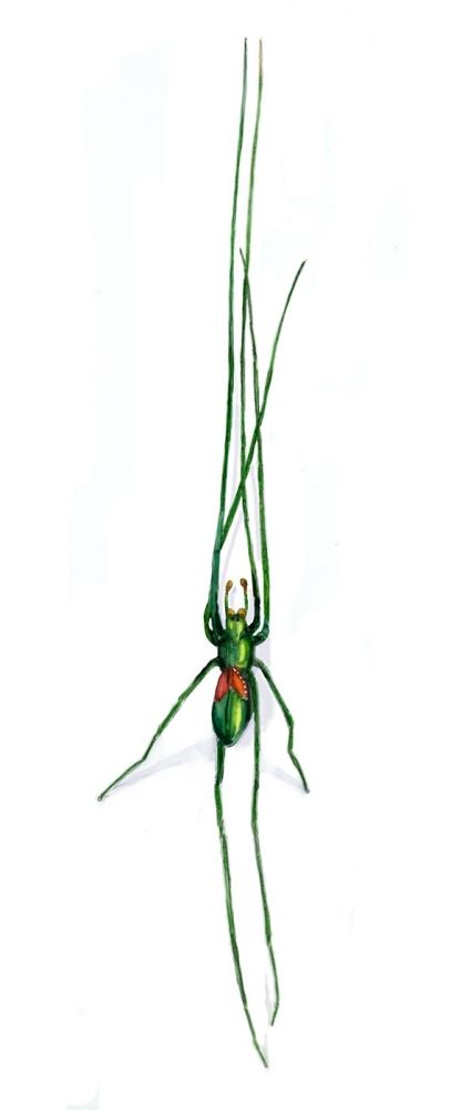 Long-jawed spiders are orb weavers with long legs that extend straight ahead and behind when at rest. This habit, together with the spiders’ long jaws and bodies, makes for a twiglike appearance that earns them a second moniker: “stretch spiders.” Subtle stripes complete their camouflage, allowing them to blend seamlessly with twigs and grass blades.