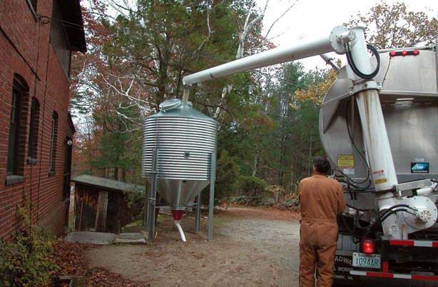 Scott Nichols owns Tarm Biomass in Lyme, New Hampshire, which has been selling and installing wood- and pellet-burning central heating systems since the early 1980s. “You don’t need a woodshed for pellets,” he says, “but you do need a silo or a bin in the basement” to take advantage of bulk delivery. The silo looks like a typical silver-colored grain silo and is most often used in commercial applications. For homeowners seeking a less industrial look, cloth bags that hold 5 tons or more and sit in a wooden cradle can be installed in most basements, with just a hose leading outside for filling. “The truck pulls up, and the delivery itself is pretty boring,” said Nichols.