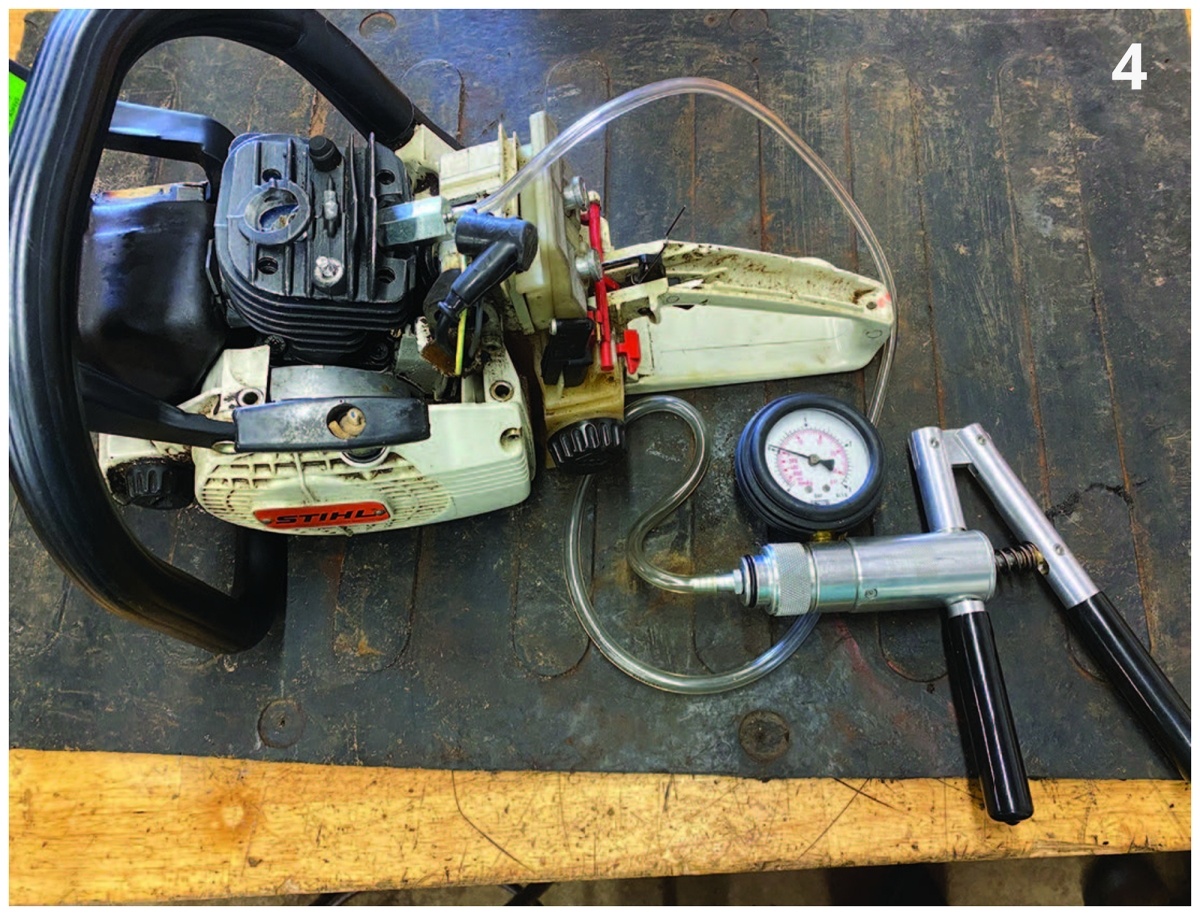 Next, remove the spark plug and replace it with a pressure tester plug. Attach the hose from the pressure tester hose and pump until it reaches 7 PSI. (Image 4) Watch the gauge for 10 seconds and note if it loses pressure. Any drop in pressure indicates an air leak in the engine, which must be repaired. To locate the leak, spray soapy water over any possible leak points (base of the cylinder, crankcase halves, and the crankshaft seals behind the clutch and flywheel) and observe where bubbles form.