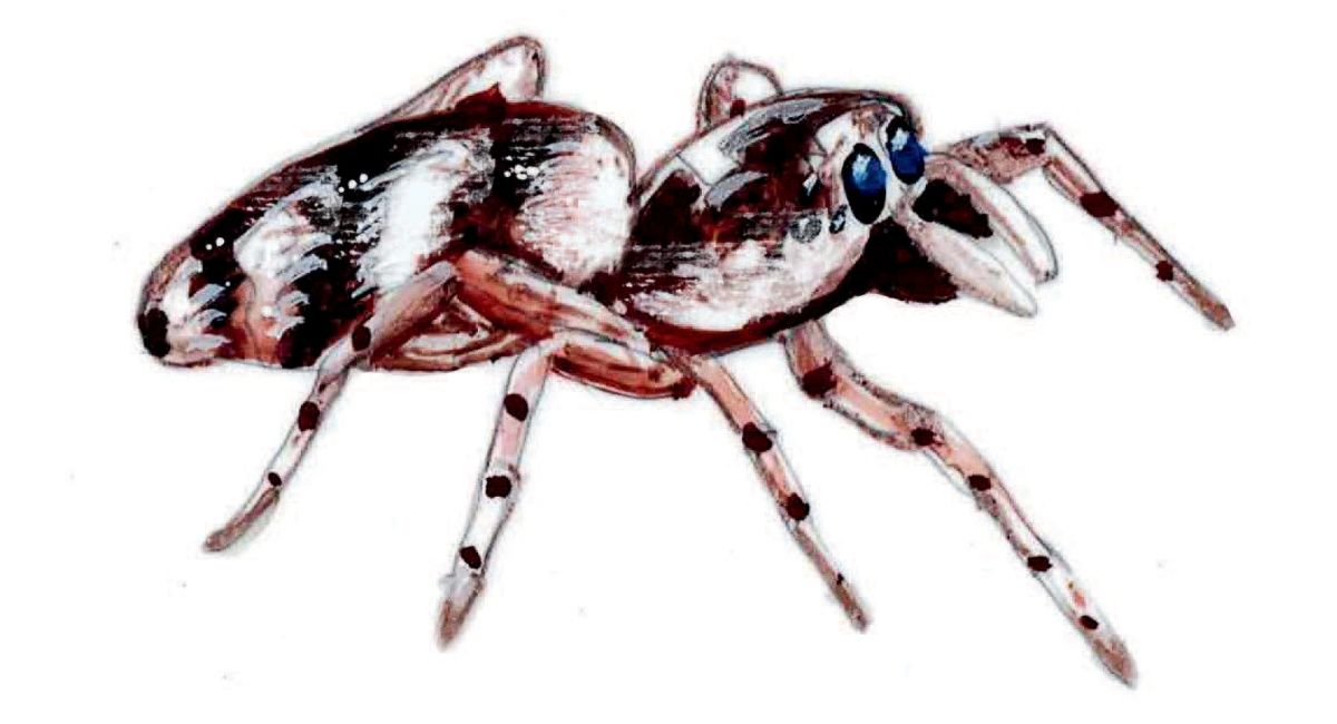 During my first lecture in front of a large room of students, a small spider put me – and my 220 students – at ease. As I flicked on the overhead projector, I spotted a ¼-inch spider with large eyes and fuzzy-looking body under the glass. This was a jumping spider of the family Salticidae, and, right on cue, it jumped the width of the projector. From the students’ perspective, that jump seemed to span the entire width of the room.