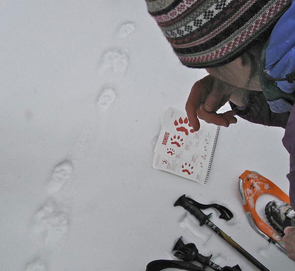 Later, a series of roundish footprints catches Patch’s eye. Everyone stops. “This one looks really classic,” says Patch, pointing out the asymmetrical toe pattern and lack of claw marks that indicate a feline instead of a canine. “We know bobcats are in the area, but they’re not very common,” says Joan. “We’re pretty excited if we see cat tracks.”