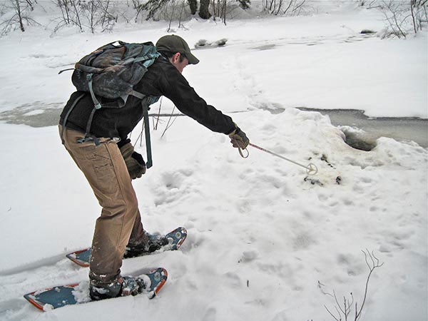 Bill points out a paper birch with four parallel diagonal scratches – bear. “Before we took tracking, I walked by this tree a hundred times and never saw the claw marks,” he said. Tramping through the snow, we come across a trail of widely spaced prints in clusters of four. Joan sets down a waterproof tracking guide with life-size illustrations and measures the prints. Everyone agrees it’s a fisher. “We found a fisher scent post,” Bill recalls, explaining that it is a spot where this member of the weasel family marks its territory and communicates with potential mates. Eager to share their discovery, Joan and Bill lead us up a hill to what turns out to be a tiny tree stump. Squatting down, Joan waves me over to see the fine hairs caught in splintered wood.