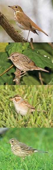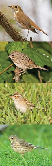 So, what have we got? LBB #1 is a hermit thrush. Its rusty tail helps distinguish it from other closely related woodland thrushes. LBB #2 is a Lincoln’s sparrow. The ultra-fine streaking on the breast and flanks is a great mark on this species; most other sparrows show wider streaks than this, if they have them at all. LBB #3 is a clay-colored sparrow. One hint on sparrow identification is to note first whether your bird is streaked or clean below. Then look at the face for distinctive markings. LBB #4 is an American pipit. No self-respecting pipit will be found in the shrubs among sparrows.