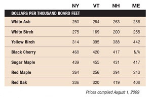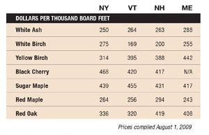On our Mill Prices page in the Summer 2009 issue, we presented a chart showing the sawlog value of red maple versus sugar maple. Our caption suggested that the dollar amounts on the left-hand axis showed the price paid to landowners. Of course, these figures, and all the figures on the mill prices page, reflect what mills and buyers pay for logs. The cost of logging and trucking needs to be subtracted from the figure to arrive at the actual dollar amount a landowner might receive for his or her wood. We apologize for our mistake.