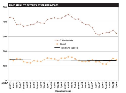 Over the past decade, hardwood prices scaled the heights and plumbed the depths, but the prices paid for beech sawlogs remained remarkably steady. Does this mean that beech was a safe bet in a period of market turmoil?