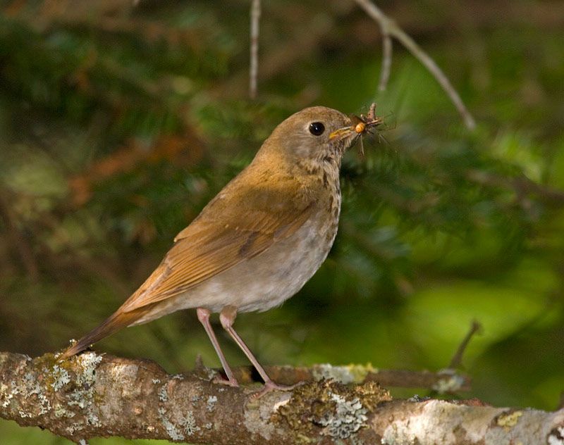 But there can be no fakery in a bill full of food. The Bicknell’s thrush had mouths to feed. So I kept watching. She vanished into the bough of a balsam fir, and I could hear the chirps of hungry young. From a safe distance, I was able to watch her shove her haul of earthworms down their throats. Now if only northern goshawks would calm down and practice a little détente.