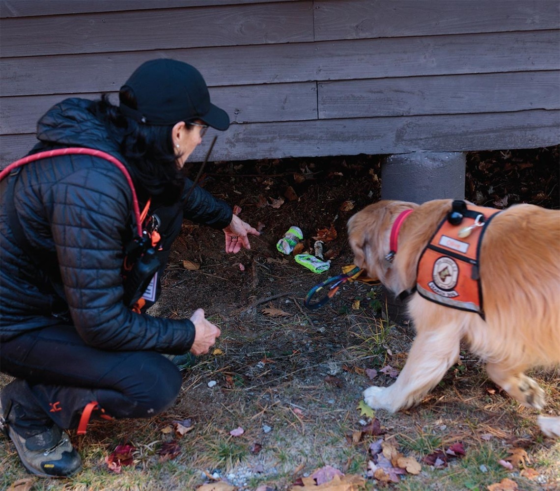“You’re not just training the dog; you’re training the handler, too,” said Jennifer Vaughan, a retired English teacher who became certified with NEK9 in 2015. She works with her golden retrievers, Olive and Harley. “The testing process is extensive. By the time we get out to search on our own, we’re ready. And we have to be.”