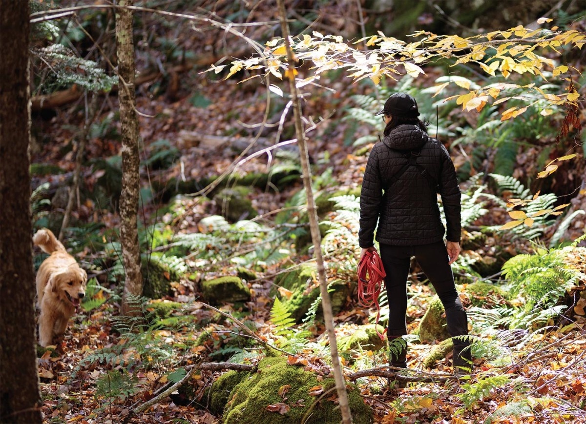 Larson steers Ryker back and forth within the grid, up hills, through dense undergrowth and more sparsely spaced trees, and down into hollows. Every few minutes, Larson checks a handheld GPS device to review the ground they’ve covered and to ensure they’re within the boundaries of the area they’ve been assigned to search. Occasionally, she stops to blow a loud whistle and calls out, listening for Menard’s voice. At these times, Ryker pauses, his black ears upright and alert.