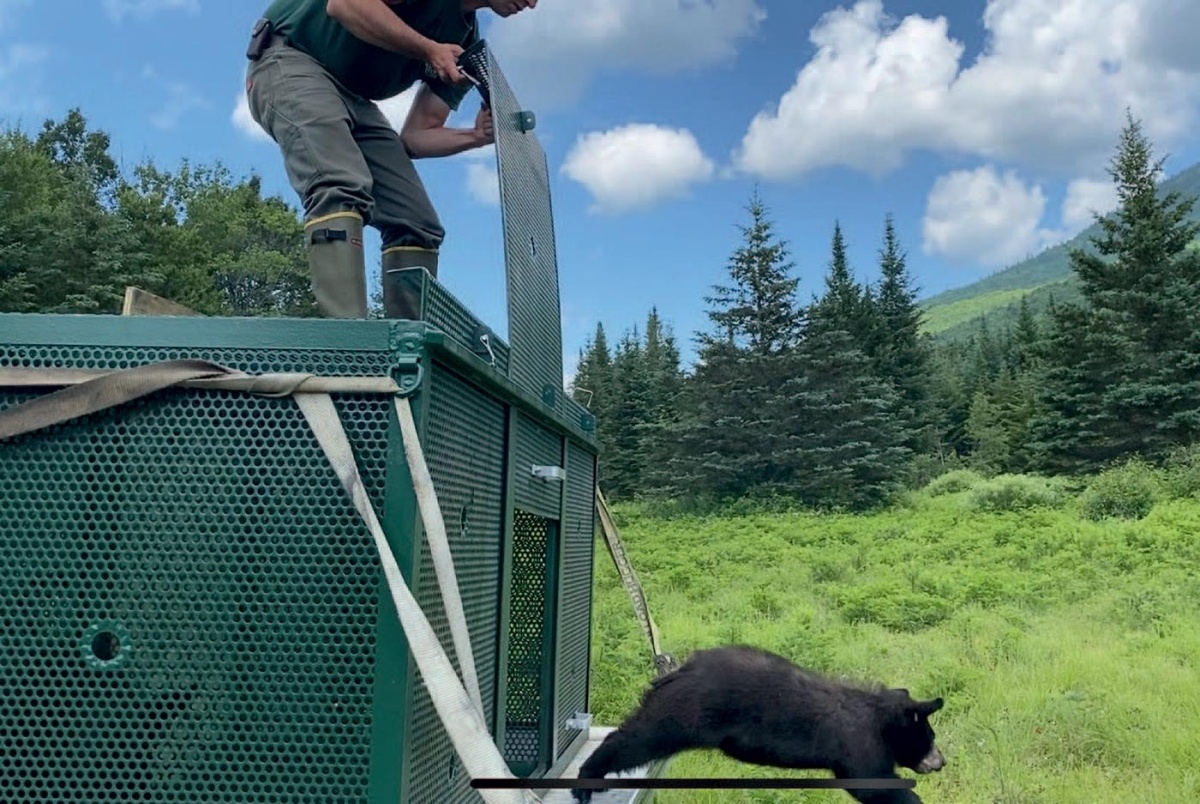 Eventually, I park my car off a main road and join Fish and Game biologist Jake Debow in the truck’s cab. We drive a bit farther, then pull off the pavement onto a rough dirt road that will bring us – and the bears – deep into the forest. We bump along for a while, until Debow turns into a small meadow, bordered on one side by woods and on the other by a brook. He parks the truck, climbs atop the cage, and opens one of the doors. A ball of black fuzz bounds out and disappears quickly in the tall grass. Soon we hear a splash as the yearling reaches the water.