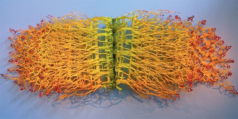 “Sowing Good Will” is a sculptural painting that sprang out of Hack’s interest in physics. She set out to follow a mathematical puzzle that addressed motion through space and the behavior of matter. She took a flat plane, in this instance a sheet of Japanese mulberry paper called kozo, cut openings in it, and then furled it back upon itself. The paper is still one piece but now exists in three dimensions, rippling through a gradation of color and complexity. Hack succeeds in conveying a strong sense of energetic dispersal in this piece, and she does this with no representation of external forms.