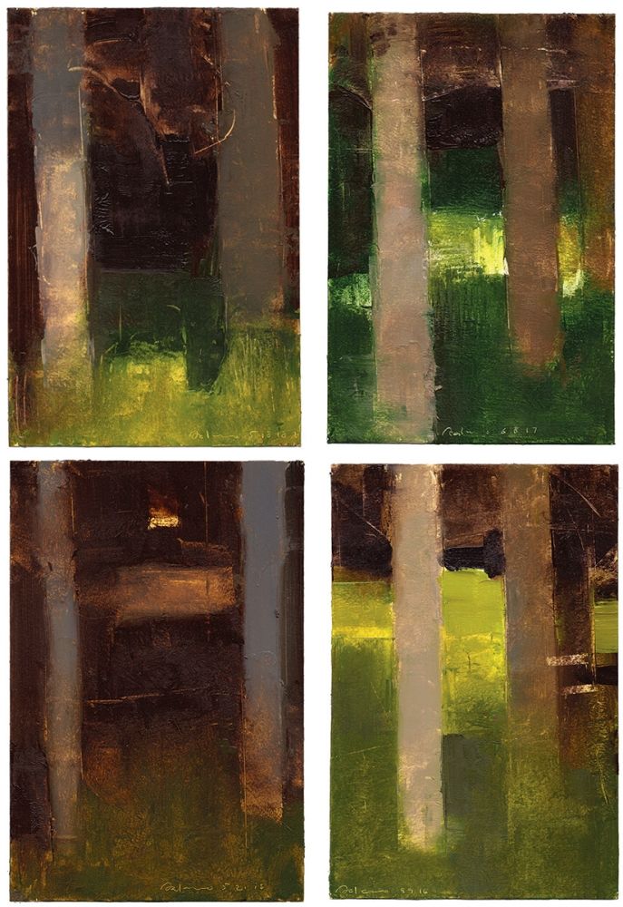 Compositionally, the majority of paintings in the “Woods Edge” series have two foreground tree trunks. These strong vertical elements form a doorway – a liminal passage – to the dark forest beyond. At times, the invitation to pass through the portal is inviting, and at other times a dare. The opposites of light and dark, abstraction and realism, foreground and background, are provocative.