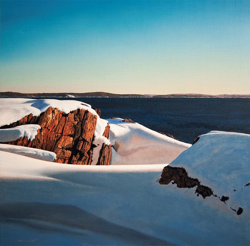 In Snow Ledges VI, the gravitas of the sunlit outcrop as it pushes towards the dark sea makes us feel the power and order of the earth. Crotty employs the bold interplay of light and dark – called chiaroscuro – to structure his painting and give it a dramatic punch. The movement of the glacial heave is a portrait of nature at a certain time in a certain place, but it also portrays a profound sense of timelessness. It is a splendid study in the tension of opposites – between light and dark, cold and warm, wet and dry – that are highly rendered in places and simply suggested in others. It is the back and forth of these extremes that grabs us in the gut and gives this painting its complexity and depth.