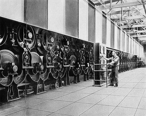 After the three presses, the sheet of paper entered the drying sections. The main section on Number 3 paper machine consisted of thirty-six big round drums. Steam was pumped into the dryers at about 125 pounds of pressure from both top and bottom. The first of these dryers applied low heat, and each subsequent dryer gradually increased the temperature. “You don’t want it too hot near the wet end,” Berube explained, “[because] it will set what they call a curl in your sheet. You want to keep your sheet flat.” The sheet of paper retained only about 2 percent moisture when it emerged from the first set of dryers. It entered the size press, where starch and other chemicals called “fillers” were added; they gave the final sheet its special surface properties. In the size press, the sheet regained considerable moisture, most of which was then removed in the ten after-section dryers.