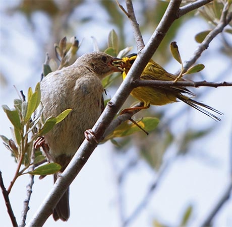 The most poignant evidence of all this comes after the cowbird fledges. Birders occasionally encounter an elegant songbird – a northern cardinal, a chipping sparrow, or a yellow warbler, for example – feeding a hulking cowbird chick out of the nest (see photo). It’s like a human mom with triplets feeding a fourth who happens to be an NFL linebacker.