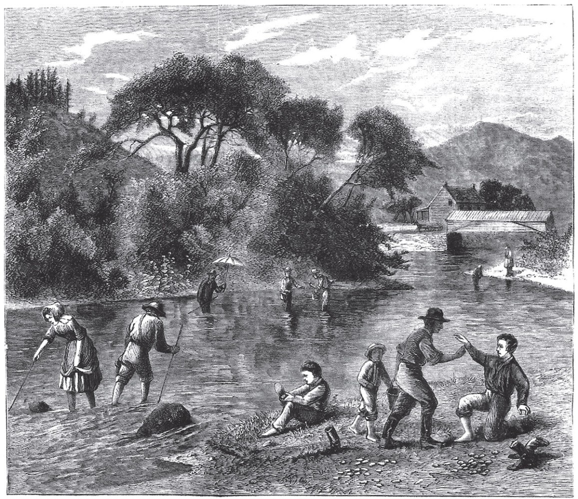 As word of the discovery spread, fortune-seekers took to rivers throughout the eastern half of the country to exploit the bounty that was teeming in their waterways. Many, like nineteenth century outdoor writer Sara Muller, waded in rubber boots in late summer or early fall, when the water was low.