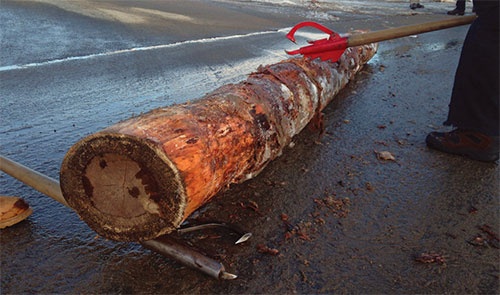 While crosshauling is an effective way to adjust the angle of the log, it can be slow since you’ll need to move and reset the peavey. An alternative method that’s often used in competitive lumberjack sports is the “pop,” where a second peavey is laid down at one end and used to lift and pry the log back to correct the rolling angle. Once you and your partner are proficient at this, you’ll be able to pop and roll the log as a single motion. However, be careful that the log doesn’t roll far enough up the horizontal peavey to catch your fingers!