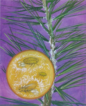 Adelgids are tiny, sap-sucking insects that are closely related to aphids. All adelgids infest conifers, and many of them have complex life cycles and use different host plants at different stages of their life cycle. The pine bark adelgid, however, stays on pine, almost always white pine, but occasionally it infests jack pine, Scots pine, or other pines.