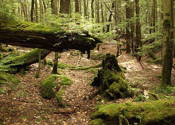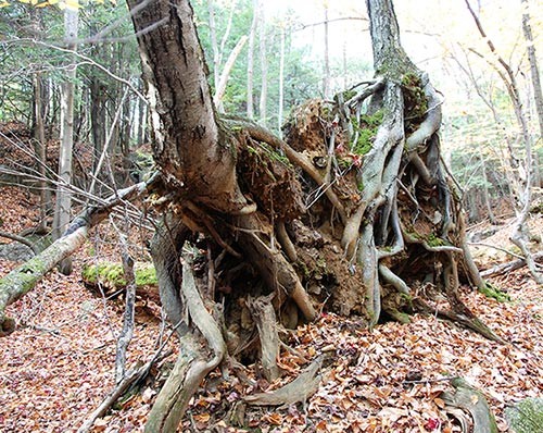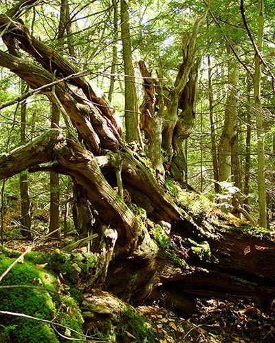 Pisgah furnished Fisher with a grand laboratory for the investigation of nature in the raw. Fisher and his students commenced their studies in the old-growth areas, and were soon tallying its assets. They were struck by many features: the immense height, mass, and age of the trees; the variation in tree size and species, both in individual stands and across the landscape; and the abundant evidence of natural disturbance – wind, ice, insects, pathogens, and even small fires. Most striking were the features not found in typical New England forests: There were windthrow mounds ten feet high, immense dead snags that reached up so far they were lost in the canopy, and the fallen carcasses of trees up to four feet in girth that seemed to molder on the ground for decades.
