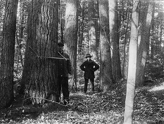 By the time Richard Fisher died of a heart attack in 1932, at the age of 54, his interpretation of the Pisgah landscape had been reinforced with solid data. Three of his students – W.C. Branch, Robert Daley, and Thomas Lotti – spent two years ferreting out and studying all of the ancient stands and following the loggers’ fresh trail through the areas that had been cut. They studied 68 old-growth patches that either escaped logging or were located and sampled just before the axes and saws arrived. In 28 harvested stands, the ages and growth histories of the immense trees were recorded by laying a strip of paper across each fresh stump and then marking the tree pith and every 10 years of growth out to the bark and outermost ring. The students examined each site for evidence of past disturbance by laying out a few transects across the entire landscape and sampling at points along them to evaluate the variation in sites, forests, and history. Though their story would not become widely known until Al Cline and Steve Spurr mined it for their classic paper “The Virgin Upland Forest of Central New England” in the early 1940s, the students’ joint thesis became a treasure in the Harvard Forest Archives and lore to all who worked and studied there. Cline and Spurr captured the major message from their work: