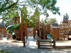 Starting in the early 1970s, the design firm of Leathers and Associates in Ithaca, New York, has been hugely successful designing playgrounds for schools and parks that were built by the local communities. Their fanciful designs featured towers, bridges, and tunnels, as well as the familiar swing sets and seesaws. What made these play structures so different, apart from community involvement in their construction, was that they were made mostly of wood. The aesthetic appeal of these new wooden playgrounds was seductive to many communities, and they soon became a common sight across the country.