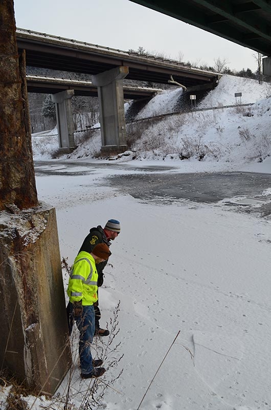 The scientists scrambled down the slope and followed the shelf. Red fox and bobcat tracks confirmed that animals were using this underpass. Game cameras (part of Vermont’s complement of 124 cameras used to monitor wildlife’s interaction with roads) mounted on concrete bridge supports have photographed deer, fisher, and mink. Hilke mentioned that, along with the investment in infrastructure, conservation easements will need to be secured (or zoning changed) to ensure that adjacent private lands between this wildlife crossing and the nearby state forests are not developed.