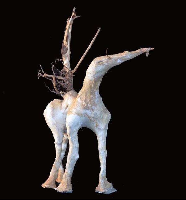 The individual sculptures in this installation are made with Abaca paper, a material derived from banana leaves. Moss beats the cellulose plant fiber down with a pulp-making machine that was developed in the 17th century called a Hollander beater. Once the thin, translucent paper is made, it is pressed over forms constructed of twigs, wire, plaster, and clay. When the resulting “skin” dries, it is reminiscent of goat skin vellum and reveals the haphazard structure that lies beneath. Occasionally, twigs and wire poke through the outer layer of hide, as if the creature is in the process of being formed or, conversely, is starting to fall apart. Moss is exploring her world, asking the question, “What is our time here on earth all about?”
