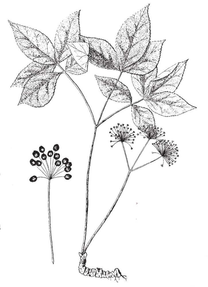 Wild sarsaparilla is an unassuming herb. Between 1 and 2 feet tall, its solitary stem diverges into three compound leaflets. Each leaflet is further divided into five sub-leaflets with toothed edges. Poison ivy (Toxicodendron radicans) and hickory seedlings (Carya sp.) are similar in appearance, but both of these are woody stemmed, and poison ivy’s leaflets occur in threes (not fives). Hidden under the leaves of wild sarsaparilla, like a person huddling under an umbrella, are the plant’s leafless flower stalks. Tiny, greenish white flowers grow from three globular flowerheads. They look like a trio of fireworks caught in mid explosion.