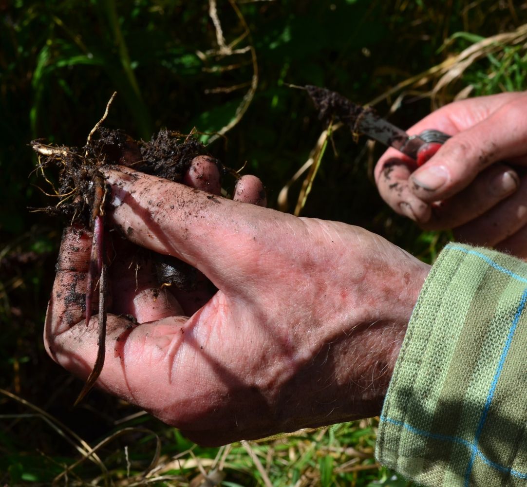 They were harder to find now that it was September, as the plants had finished blooming and their leaves had begun to dry up. But soon King spotted a tall, greenish-yellow stalk topped with a spike of green fruits containing seeds. He measured the orchid at 40 inches high and took a GPS reading of its location. Next, he carefully cut half a leaf from the plant and placed it into a paper coffee filter to dry. He removed two seed capsules and put them into a coin envelope. (Our instructions were not to collect more than 10 percent of the seed.) King then dug around the base of the plant with his pocketknife, searching for the roots. “The soil is good and wet, as you’d expect,” he commented, examining a handful of brown muck. About two inches below the surface, King found the roots of the orchid. He cut a few and placed them in plastic bags with a damp paper towel to keep them moist. Each bag and envelope was carefully labelled according to North American Orchid Conservation Center’s specimen-tracking protocol.