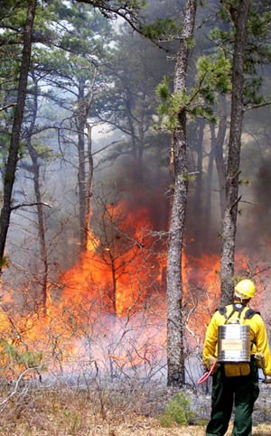 Kendziora is helping landowners make habitat in every state across the New England cottontail’s range. One area with a good population of New England cottontails is Upper Cape Cod, where more than 400 acres of fresh rabbit habitat have been created by the Town of Mashpee, Orenda Wildlife Land Trust, the Wampanoag Mashpee Native American Tribe, and the Trustees of Reservations, along with the state of Massachusetts and the U.S. Fish and Wildlife Service’s Eastern Massachusetts Refuge Complex. Many of the tracts abut or lie close to each other. And only a mile down the road is the Massachusetts Military Reserve at Camp Edwards, where wildlife biologists have conducted controlled burns on more than 1,500 acres of coastal scrub since the 1990s and where a robust New England cottontail population remains. The use of fire in this sandy coastal environment removes dead vegetation and makes it less likely that large, out-of-control wildfires will flare up in the future. Prescribed burning also renews scrub oak, a lowgrowing, fire-evolved oak that’s more of a shrub than a tree and, when young and dense, offers great rabbit habitat.