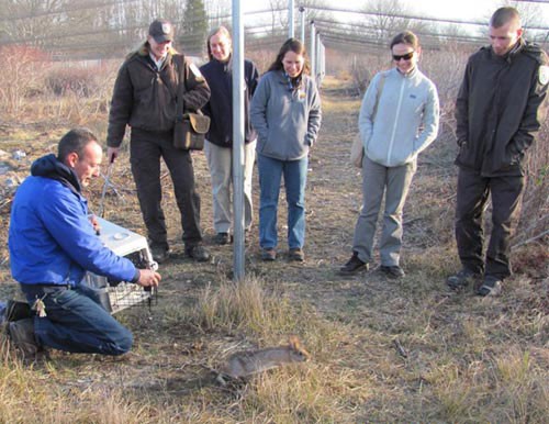As of March 2013, 17 female and 10 male New England cottontails were housed at the zoo, with the year’s breeding just getting underway. So far, 15 captive-bred rabbits have been released on brush-covered Patience Island, a 210-acre uninhabited island in Narragansett Bay. This year biologists hope to confirm natural reproduction there; if the island population thrives, it could become a source for restocking other areas. Conservationists have also built two hardening pens, at Ninigret National Wildlife Refuge in Rhode Island and Great Bay National Wildlife Refuge in New Hampshire. Young captive-bred rabbits will spend a month in those one-acre, predator-proof enclosures learning how to hide in cover and feed on native vegetation; then it’s off to the real world, red in tooth and claw.