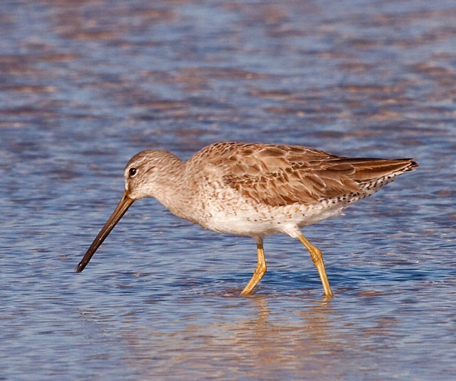 Behavior and Sound – Dowitchers and many other sandpipers feed in mud or shallow water with a steady jabbing motion reminiscent of a sewing machine. Plovers search visually for food. They look around, run, stop, snatch food; look around, run, stop, snatch some more. We don’t use vocalization with shorebirds as much as we do with songbirds, but listen nonetheless. The least sandpiper’s rolling kreeep and the willet’s funny pill will-willet are diagnostic.