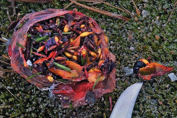 Willow ptarmigan’s Latin name means “hare-like feet.” And in winter, the soles of their feet become so completely covered with feathers that they do, in fact, resemble snowshoe hare feet. The feathers provide protection from the cold and snowshoe-like flotation. A physiologist from the University of Alberta, E.O. Höen, reports that the sole feathers increase the bearing surface of the ptarmigan’s feet by four times, which increases by 50 percent the bird’s ability to stay on top of the snow. In addition, I am convinced that the structure of the legging feathers contributes to this winter-hardy bird’s ability to stay on top of the snow. Legging feather tips, which extend to the ground, serve as a strong but flexible edge to the foot, comparable to the frame of a snowshoe. Interlocking feathers covering the bottoms of the feet are extremely lightweight and perform like the webbing of a snow-shoe’s interior. The feathers also significantly reduce conductive heat loss from the foot itself. Long claws extend beyond the feathered foot and provide traction when needed.