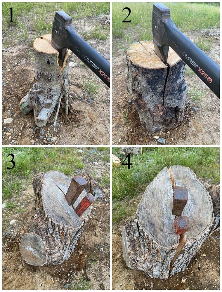 Use wedges. For the gnarliest blocks you’re going to need a sledgehammer and a pair of wedges. Owning a few wedges is essential, because knot-filled logs often need to be “unzipped” with multiple wedges used in a line. This particularly gnarly block required two wedges to split. If the wedges had both bottomed out without the block splitting, I would have added a third wedge, and so on. (Images 3 and 4)