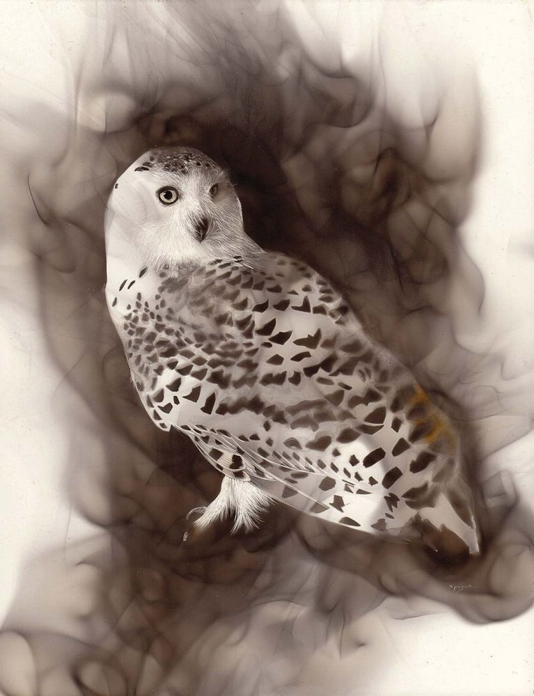 The fumage technique lends an ephemeral note to Smoky Owl. The wispy tones of grey impart a fragility or temporary nature to the owl’s noble portrait, a theme that Spazuk notes lies at the center of his work as a fine artist: “Fire has destructive and constructive properties, which can give life and take it away. [My] compositions allude to this force in nature, as they reflect the fragility and grit of life on earth.”