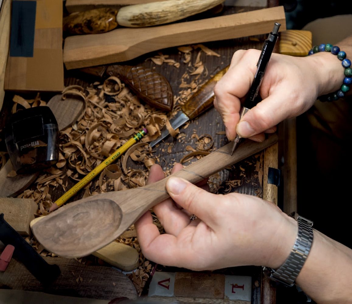 He offers this advice for beginning woodcarvers: “The wood will tell you what kind of shape it wants to be. Once you start carving into it, it might reveal some cracks and knots that will change your direction. So, what starts as a straight spoon handle might have to be a little bit crooked. This gives a spoon character. Don’t be discouraged.”