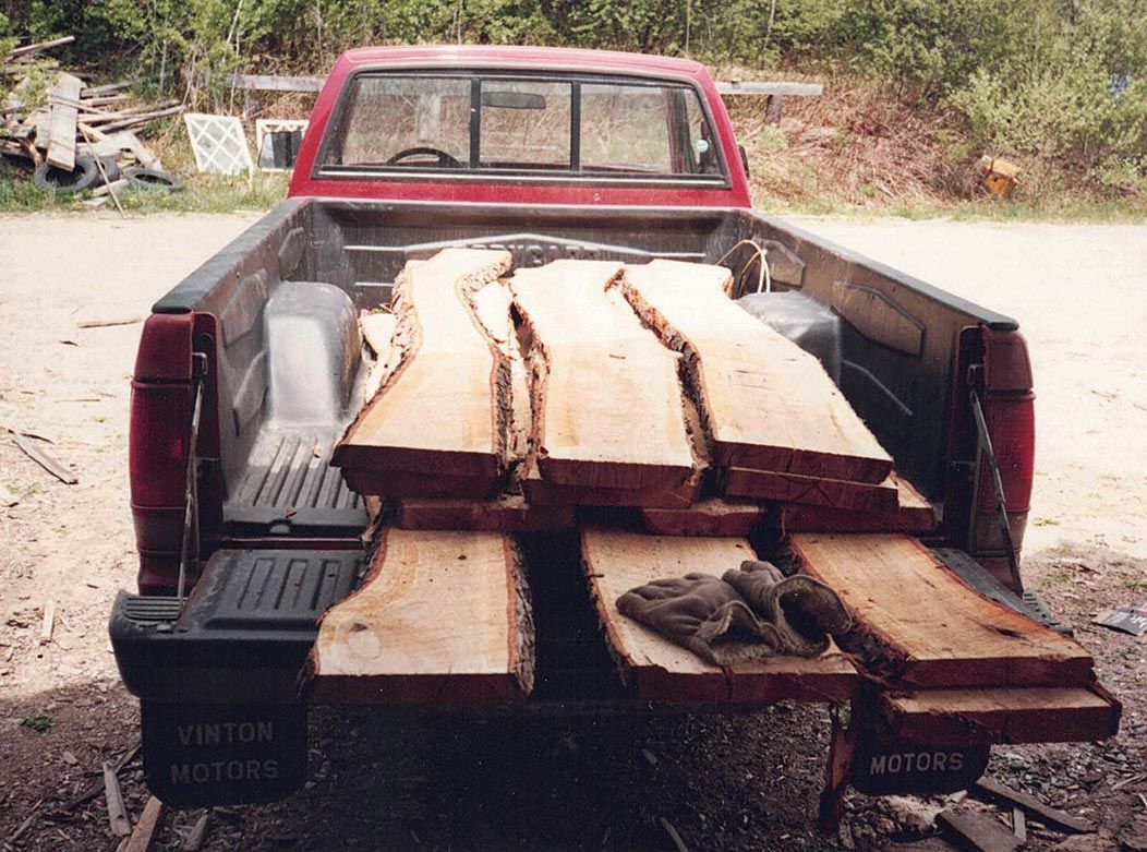 A week later, Sandy LaPerle backs his truck to the bank and we slide the logs on. He takes them to Darryl Arsenault in East Montpelier, who cuts them into six-quarter slabs. This is the year Darryl will close up his mill and move to Arizona. We drive out to get the planks, slide them – damp, covered with fine sawdust, smelling like my childhood – into our tiny red Toyota pickup. We stack them, stickered and weighted against the curl of drying in the attic over the garage.
