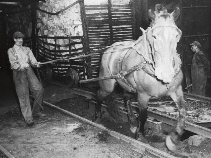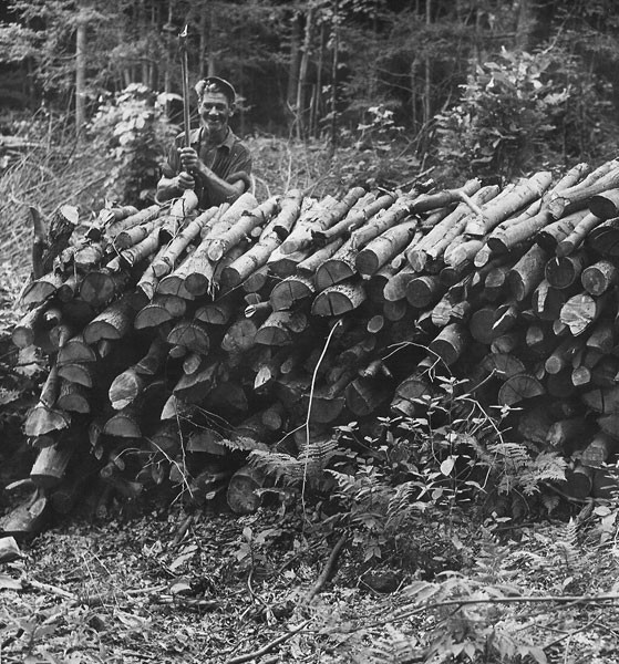 Trees were felled, cut, split, and stacked using hand tools, and the wood was placed on wagons by hand. Horses hauled the wood to a truck or rail car, where men loaded and unloaded the 4-foot lengths of wood. At the mill, wood was loaded onto carts and wheeled into and out of the retorts by hand.