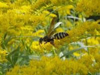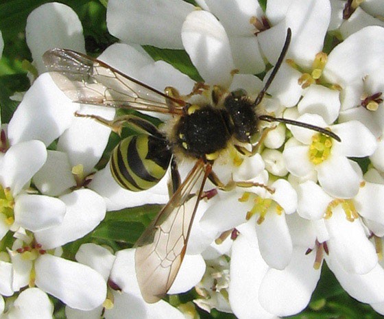 How to distinguish a bee from a wasp? Nearly all bees feed their offspring pollen, so most female bees have the habit of – and adaptations for – collecting and carrying it. If you see an insect collecting pollen from flowers, it is most likely a female bee. Most have obvious pollen-carrying brushes of hair or “baskets” on the segments of their hind legs or on the undersides of their abdomens. Wasps, on the other hand, provision their offspring with a variety of animal proteins. There is one interesting wasp group whose members collect pollen, but they don’t live in the Northeast.