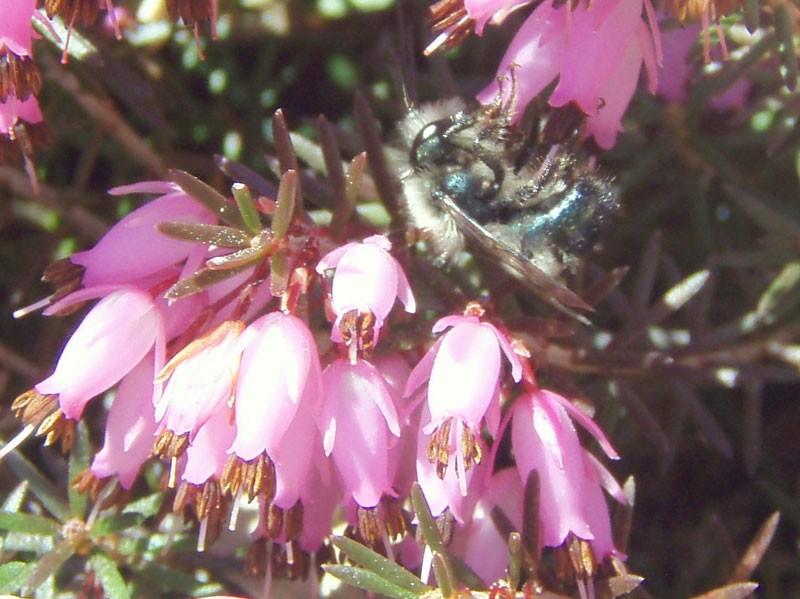 Most bees will forage on a variety of plants and may thus benefit whole communities of flowering trees, shrubs, and herbs. Bumblebees are highly visible examples of this foraging strategy, readily switching from one type of plant – and habitat – to the next. On the other hand, about 20 percent of our bees are pollen specialists, meaning that they are adapted to gather pollen from just one plant family, genus, or even species. For example, a sweat bee known to science as Dufourea novaeangliae gathers pollen only from the anthers of pickerel weed; this bee is relatively common in the Northeast, but only around the marshes that are home to this plant.