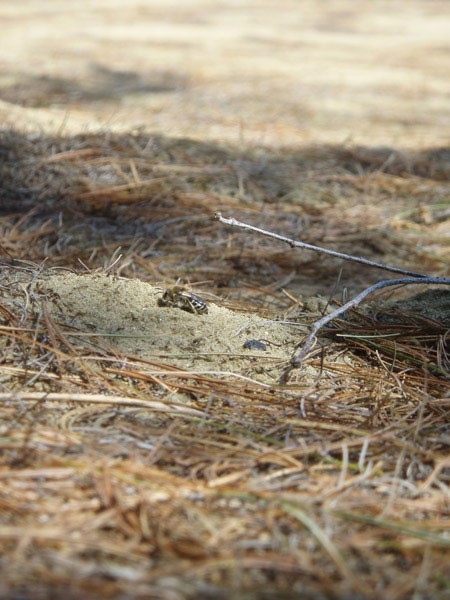 Bees have three basic habitat requirements: nesting sites, overwintering sites, and access to the plant foods to which they are adapted. Most of our wild bees nest in tunnels they dig in sandy, silty, or loamy soils. Flat or gently sloping substrates are generally preferred, and the bees often choose areas with sparse vegetation. Examples of ground-nesting bees are the many species of mining bees (in the family Andrenidae) and sweat bees (in the family Halictidae). About one quarter of the bees in our area nest in the preformed cavities they find in twigs, acorns, snail shells, tree trunks, and other wood. Many of these bees seal their nests with “doors” made of chewed leaves, which has earned them the name “leafcutter bees” (the family Megachilidae). Bumblebees (in the family Apidae, with honeybees) nest in old rodent dens, above-ground cavities in dead trees, under tussocks of dry grass, in heaps of decomposing plant matter, and many other places. A small number of bees excavate their own nest cavities in sound wood. This includes the large carpenter bees, which are often considered pests for their habit of tunneling into the siding, soffits, and porches of our homes. Carpenter bees are common in southern New England but are only rarely found north of Massachusetts.