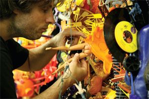 In Vermont Foliage: Out of the Landfill into the Woods, Deininger skillfully arranges broken toys, old record albums, wires, and widgets, and creates an image that appeals to us in a comforting and familiar way. By pairing the things that we don’t really care about (our disposable junk) with something we do care about deeply (the beauty of an autumn woodland), the piece raises questions about human consumerism and our effect on the natural world. Deininger feels strongly that these diametric opposites combine to form a true representation of the world we live in – an honest expression of who we are and where we live.