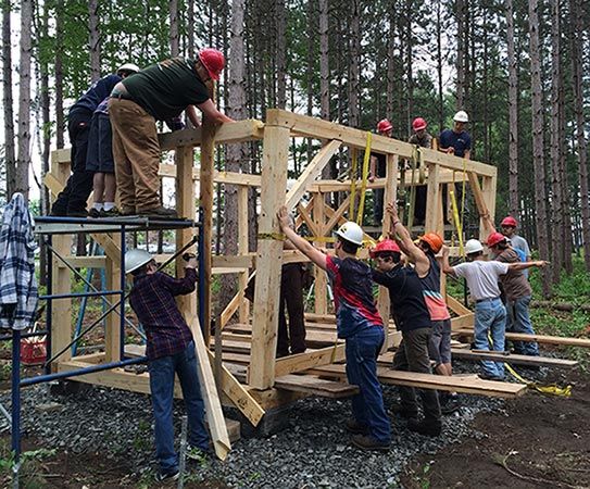 On a warm, sunny day last spring, just a few weeks before the end of the school year, professional timber framer Makaio Maher stood in a small clearing in a stand of red pine trees in Newport, Vermont, calling out instructions to two dozen high school students wearing white and red hardhats. “We need more pegs over here. Hold up, hold up – that side has to go in last. Take it up slowly.”