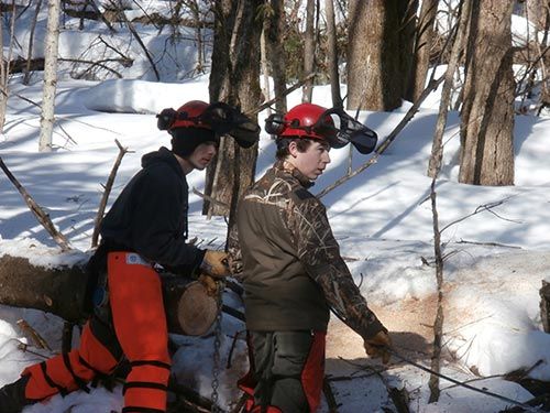 After completing the Game of Logging chainsaw safety training, natural resources students took to the woods at the Land Lab, a lumber list in hand. They looked for trees showing signs of decline, as well as trees that needed to be thinned. The harvest included rot-resistant tamarack for use close to the ground, balsam fir, and a bit of poplar.