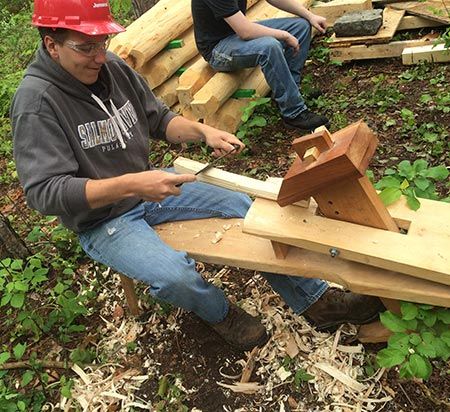While Maher worked primarily with the building trades students to create the cabin’s frame – including a practice run over the winter when the frame was raised in the shop – the natural resources students, after supplying the raw materials, also had a hand in constructing the final product, and Anderson’s English classes made many of the pegs used in the cabin.