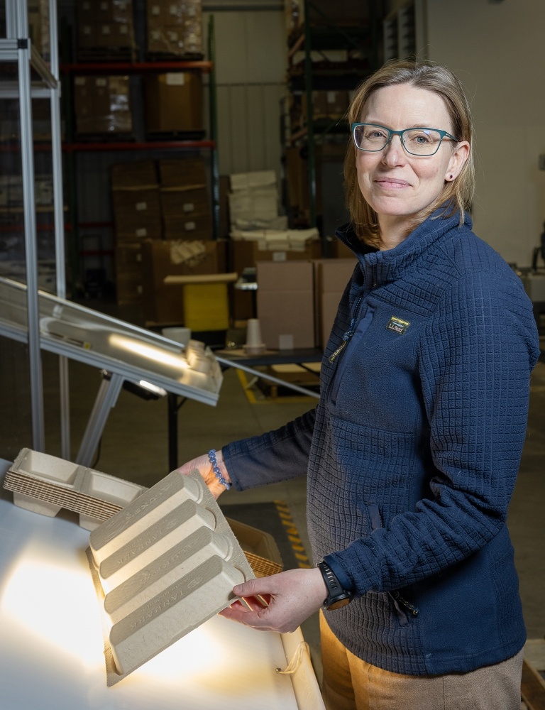 At Tanbark, LaCasse is looking to reclaim packaging from plastics, especially single-use plastics, using pulp-based Type 3 molded fiber (also known as encapsulated drying), a technology invented in Maine more than 100 years ago. She became acquainted with the opportunity because her husband’s family business, LaCasse and Westin, specializes in building machines for molded fiber manufacturers. But while most of those companies focus on commodity products – think of products like nursery garden pots (Type 1), egg cartons (Type 2) and Chinet paper plates (Type 3) – Tanbark produces high-end, highly customized sustainable Type 3 packaging at production levels accessible to brands of all sizes.