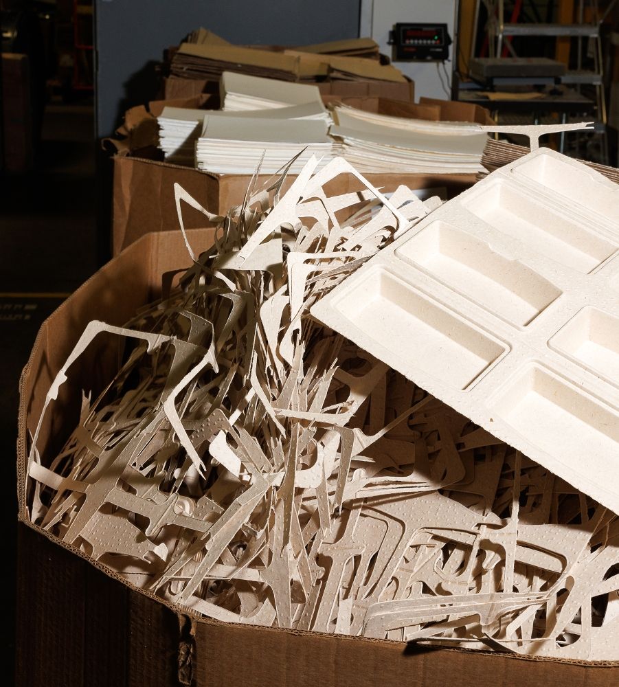 Tanbark’s raw material is dry lap: sheets of dried pulp that look, from a distance, like plain old cardboard. These are manufactured by a Maine paper mill, using sustainably harvested low-value trees. Tanbark’s machines mix the dry lap pulp with water and pour the resulting liquid into a series of heated, high-pressure molds. The end product is characterized by thin walls and smooth surfaces – the same characteristics as plastic competitors, but achieved in a far more energy-efficient way, and without their harmful impacts on the environment.