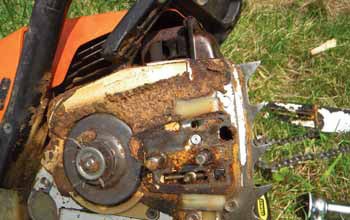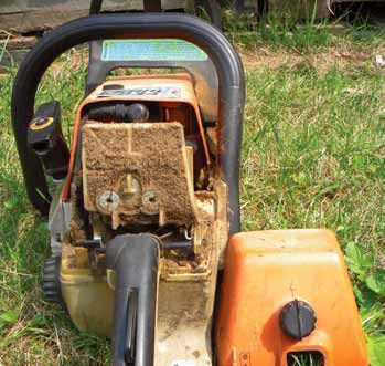 On the exhaust side, check the spark arrestor periodically. It is a little screen that covers the muffler and can be removed by loosening a small screw. I once saw a saw with an arrestor so plugged with carbon that the starter cord could barely be pulled – the saw couldn’t exhale!